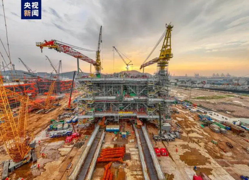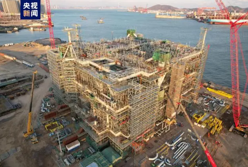 ![]() 在山東青島國際化高端裝備制造基地,一個重達17000多噸“巨無霸”,是目前在建國際上最大的油氣集輸平臺。經過34個月的施工建造,今天正式交付,月底將搭乘大型運輸船,啟程前往6400海里以外的海域進行安裝。